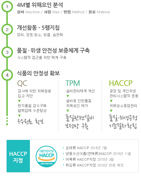 설비로 인한 품질위해 요인 제거를 위한 설비관리 체계 개선으로 TPM과 우수 원료 확보를 위한 협력업체 관리도 체계적으로 추진하고 있으며, 품질관리 체계의 으뜸이라 할 수 있는 HACCP system 운용으로 '식품의 안정성 확보'에 최선의 노력을 경주하고 있습니다.
